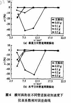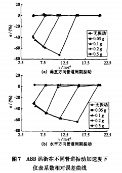 以應(yīng)力式模擬渦街流量計(jì)為被測(cè)對(duì)象,在5m/s、7.5m/s、11m/s、15.5m/s、20.5m/s流速下,分別進(jìn)行了無(wú)振動(dòng)和施加管道周期振動(dòng)的實(shí)流標(biāo)定試驗(yàn)。管道振動(dòng)方向?yàn)榇怪狈较蚝退椒较?,加速度?.05-0.5g。根據(jù)試驗(yàn)數(shù)據(jù),繪制出不同管道振動(dòng)加速度下渦街儀表系數(shù)相對(duì)于無(wú)管道振動(dòng)時(shí)平均儀表系數(shù)的相對(duì)誤差曲線,垂直方向結(jié)果如圖3(a)所示。