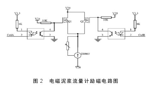 圖中的勵磁電路工作內(nèi)容是控制儀表的工作磁場。其作用原理為 :單片機(jī) MSP430F2418 定時器產(chǎn)生了雙頻矩形波,并經(jīng)光耦隔離后與兩片場效應(yīng)管組成了開關(guān)電路,從而實(shí)現(xiàn)了泥漿流量計(jì)使用的通斷功能。另一個電路 DH902 是恒流管,其為設(shè)備使用提供恒定的勵磁電流。具體來說,當(dāng) MCU 定時器的脈沖寬度調(diào)制(PWM)輸出后,經(jīng)過濾波就能有效控制勵磁電流的幅值,進(jìn)而產(chǎn)出雙頻矩形波。如圖 2 所示,為電磁泥漿流量計(jì)勵磁電路圖。