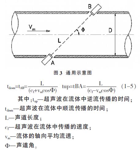 2、超聲流量計(jì)以測(cè)量超聲波在流動(dòng)介質(zhì)中傳播的時(shí)間與流量的關(guān)系為原理。通常認(rèn)為超聲波在流體中的實(shí)際傳播速度是由介質(zhì)靜止?fàn)顟B(tài)下超聲波的傳播速度cf和流體軸向平均流速vm在超聲波傳播方向上的分量組成。如圖,順流和逆流傳播時(shí)間與各量之間的關(guān)系是